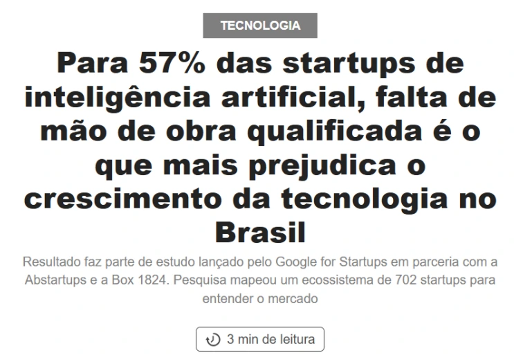 O mercado tá desesperado por profissionais com essa expertise. Uma pesquisa do Google for Startups revelou que 57% das startups de IA no Brasil não conseguem crescer por falta de mão de obra qualificada.